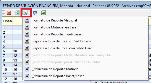 Además, este reporte cuenta con una opción para exportar, para poder realizarlo deberá presionar el icono de la impresora y elegir el formato que el usuario desee: Matricial, Matricial/Laser o formato Excel.