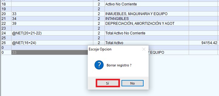 Si el usuario desea eliminar una fila, deberá seleccionar la fila y presionar la tecla “delete o suprimir”, seguido de la acción aparecerá el siguiente mensaje, donde deberá presionar ”Sí”.