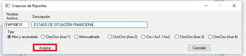 Nombre del Archivo: Este campo está compuesto por 8 caracteres, los 5 primeros los asigna el sistema (EMP99); los 3 primeros caracteres son las iniciales de la empresa (EMP) y los 2 siguientes es el código de empresa (99) y los tres siguientes deben ser las iniciales del nombre del reporte que se desee crear.