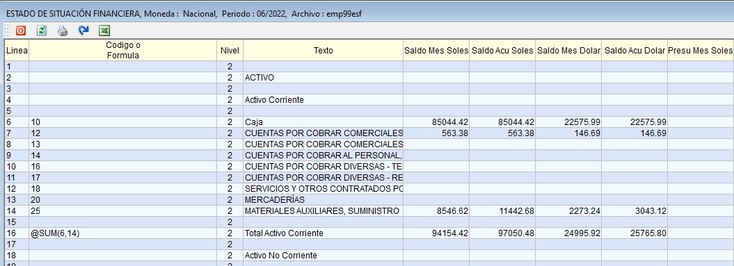 Nivel: En este campo se define el nivel de presentación, hay dos niveles el 2 y el 9. El dígito 2 significa que la línea pertenece a la operación y esta si se mostrará en el reporte y con el dígito 9 esta línea se ocultará en el reporte, pero los importes si serán tomados en cuenta para el cálculo.