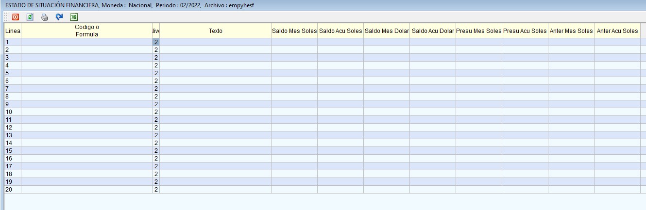 Aparecerá una plantilla con las primeras 20 líneas en blanco, en este campo se detalla la estructura del reporte: