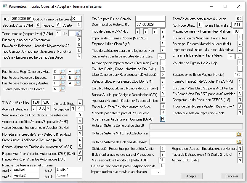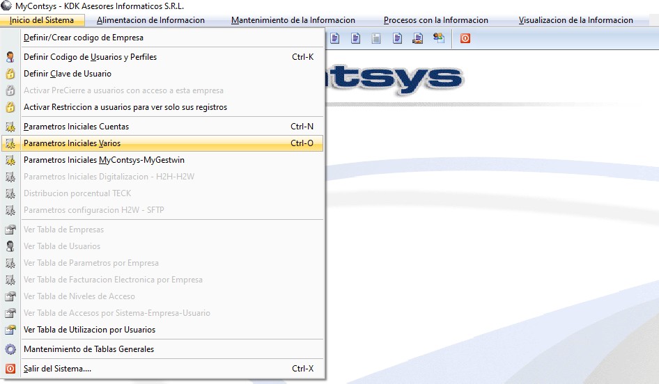 Para ingresar a esta opción se deberá ir al menú Inicio del sistema / Parámetros iniciales varios o la combinación de teclas Ctrl. + O