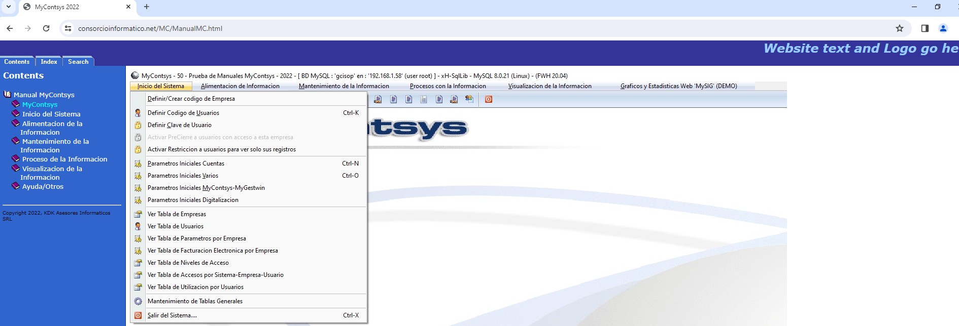 Podra acceder al manual del sistema MyContsys desde el sistema ubicandose en la pantalla principal del sistema en el menú de la opción de Ayuda/Otros, o de lo contrario presionando la tecla F1