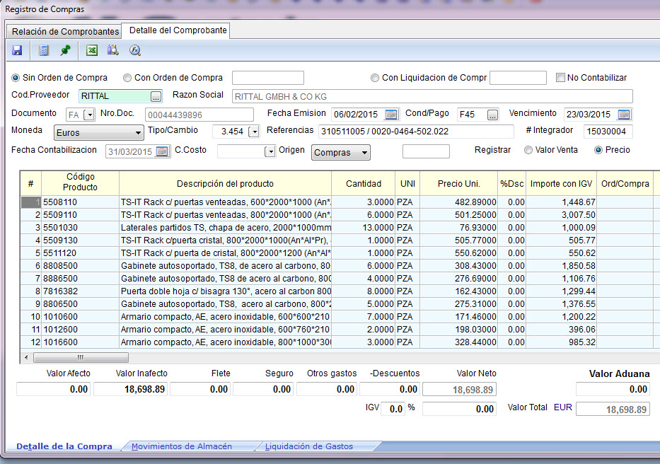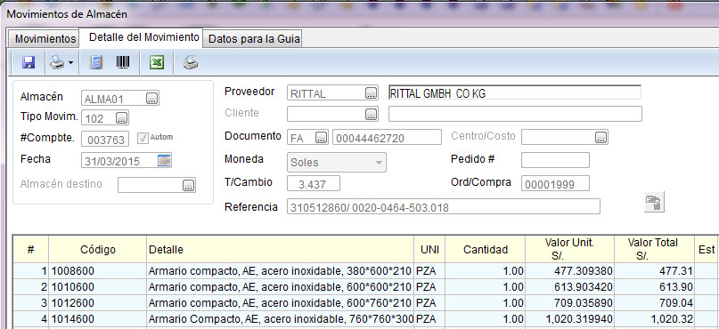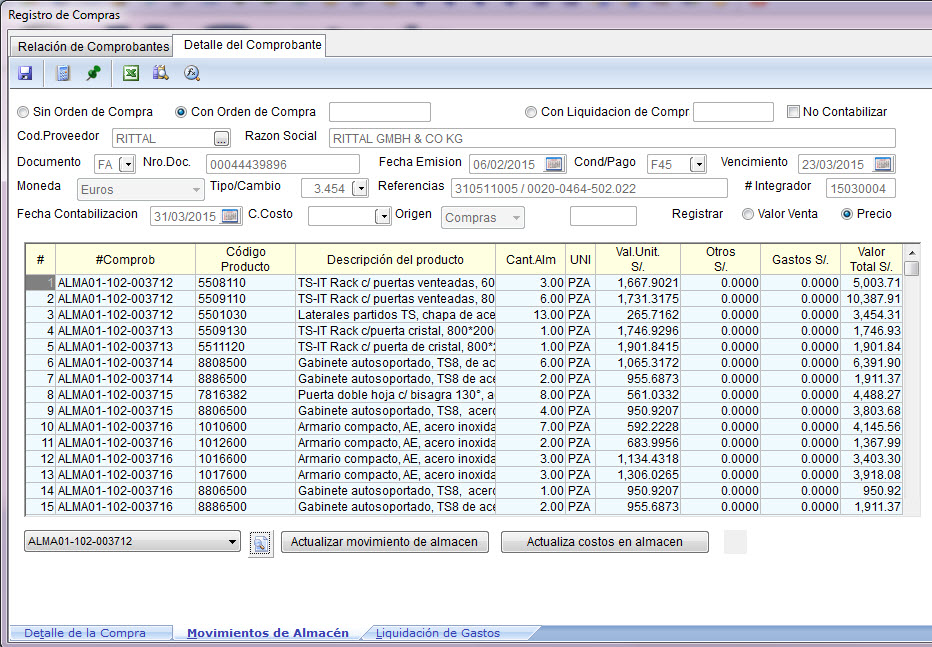 Ahora ya podemos costear los productos en el almacén de acuerdo a los valores unitarios de cada artículo que se ingresaron en la pestaña anterior “Detalle de la Compra”: