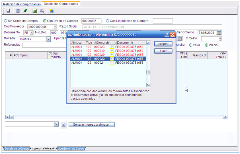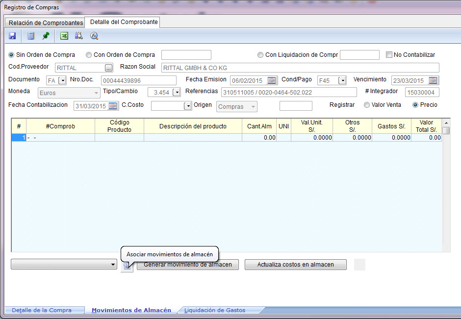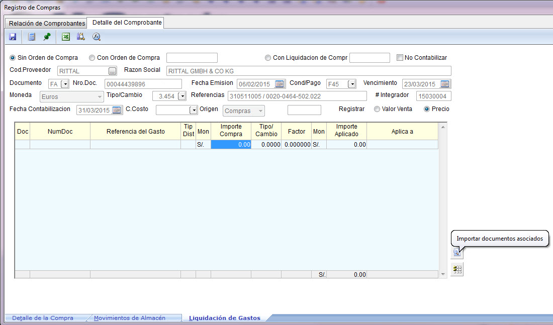 Vea con detenimiento las 3 pestañas que aparecen al pie de la ventana: “Detalle de la Compra”, “Ingresos al Almacén” y “Liquidación de Gastos”