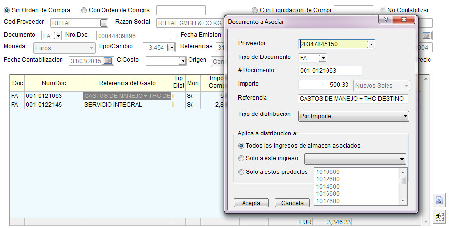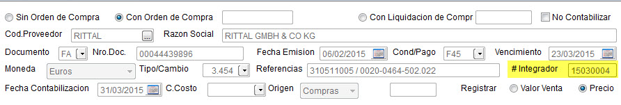 El ultimo paso es asociar otros documentos a esta factura (Ej.: gastos de fletes, tramites de aduana, etc.) que han sido registrados también por el registro de Compras. Vea que en la parte superior de todos ellos se ha colocado el mismo “#integrador “ para poder relacionarlos con otros documentos: