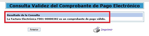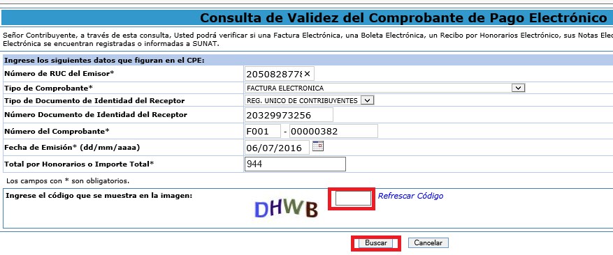 En la pantalla de Consulta de Validez del Comprobante, SOLO se deberá colocar el código que aparece y dar clic en la opción Buscar, para que de esta manera la SUNAT nos confirme que es un comprobante de pago valido.