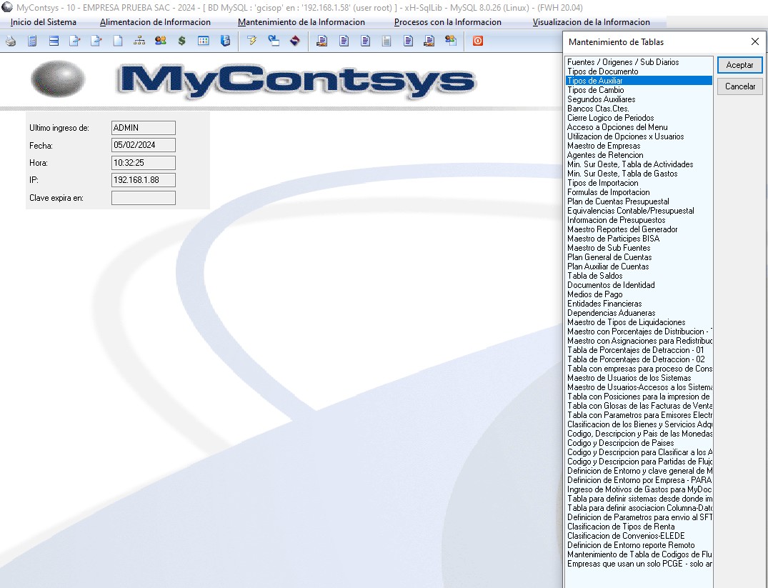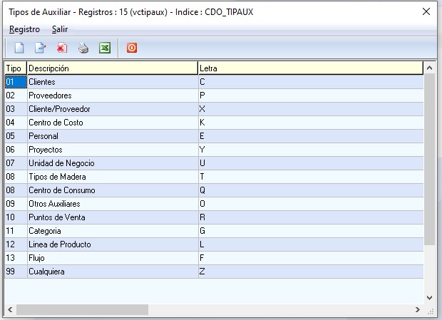 Los Tipos de Auxiliar asignados en la tabla vienen por default al momento de la instalación del sistema, al ser una tabla dinamica se pueden crear mas códigos.