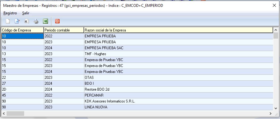 Esta opción nos permitirá visualizar, buscar e imprimir los nombres, los códigos y los años de cada una de las empresas que tenemos registradas en el sistema.