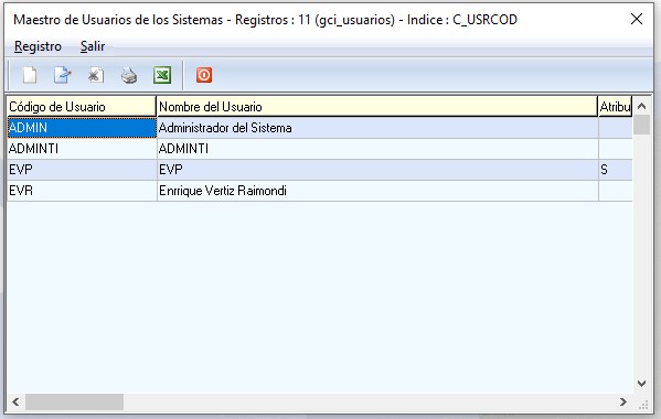 Por esta opción podrá visualizar los datos de los usuarios del sistema, código de usuario, nombre de usuario y su nivel de acceso, el usuario Admin podrá modificar y/o eliminar dichos datos según como lo considere necesario.