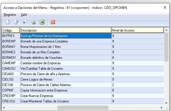 Mediante la pantalla siguiente, el usuario ADMIN podrá cambiar los niveles de usuario, restringiendo de una manera muy práctica las opciones del sistema por usuario.Ejm: