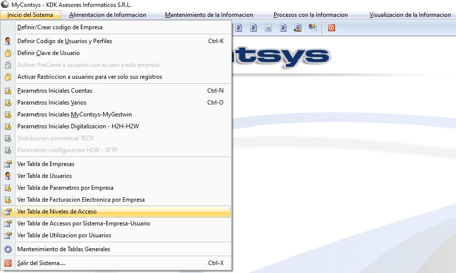 Para ingresar a esta opción se deberá ir al menú Inicio del sistema / Ver Tabla de Niveles de Acceso
