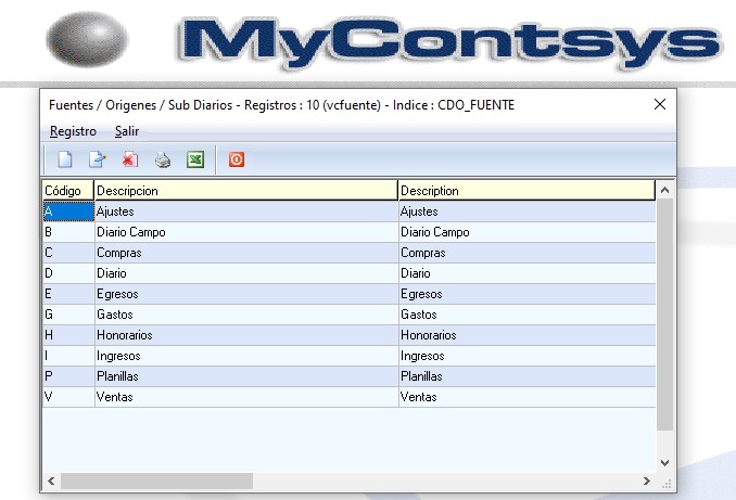 Los libros contables asignados en la tabla de fuentes vienen por default al momento de la instalación del sistema, al ser una tabla dinamica se pueden crear mas códigos.